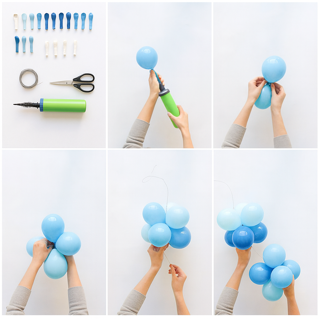 1️⃣Возьмите надутые гелием шары одного размера, свяжите их за хвостики попарно.